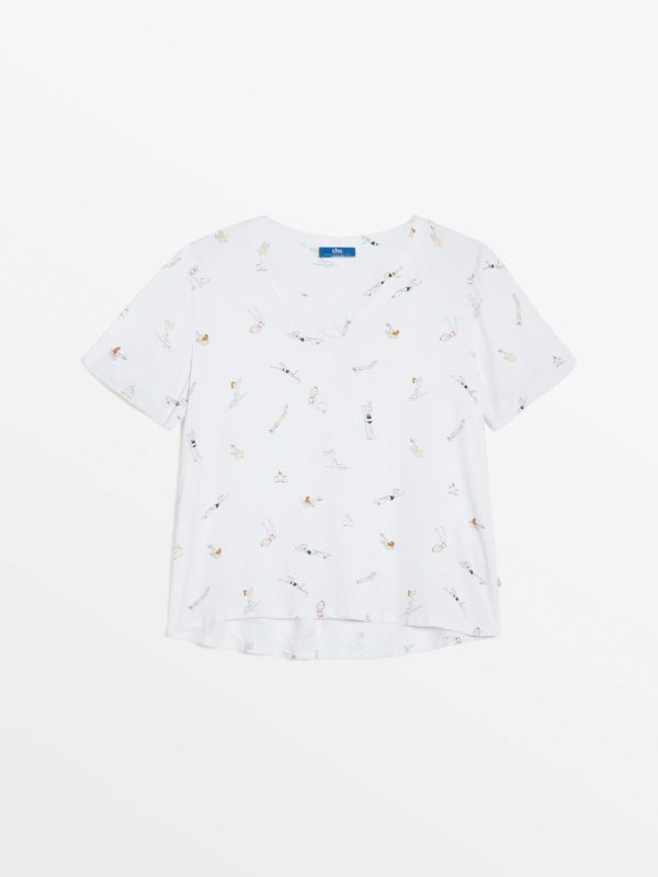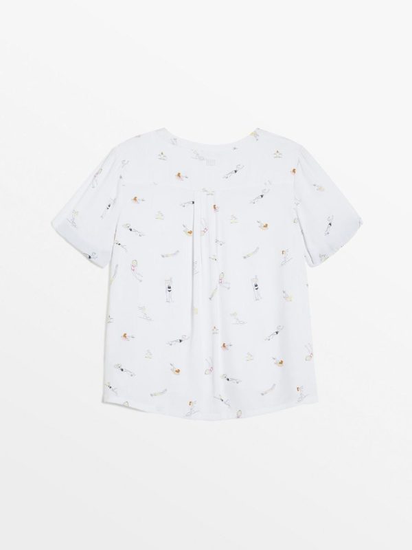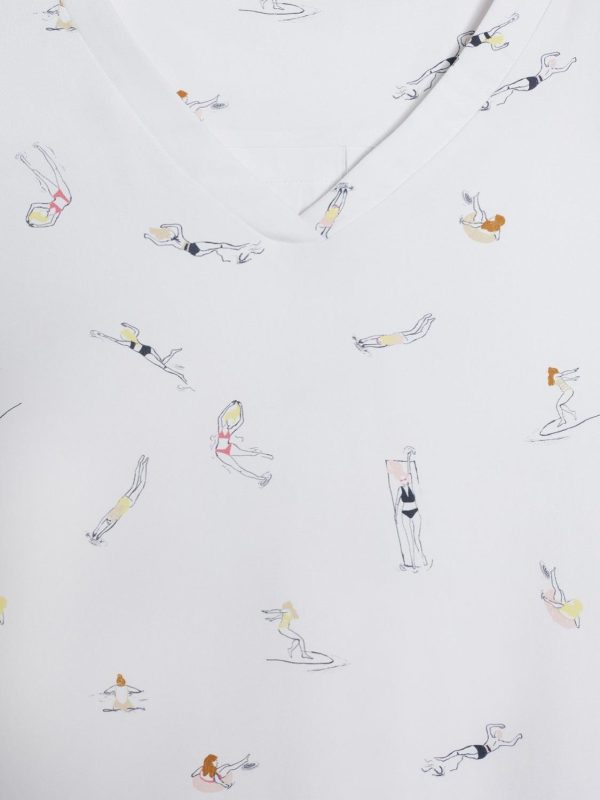 Ce modèle a été travaillé pour l’entrée de saison. Cet imprimé à la teinte nautique suggère le début de l’été par des baigneurs subtilement colorés. Les détails de jour échelle sur le panneau avant et les bords cotes aux poignets apportent de la richesse au modèle en viscose plate.
