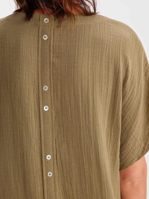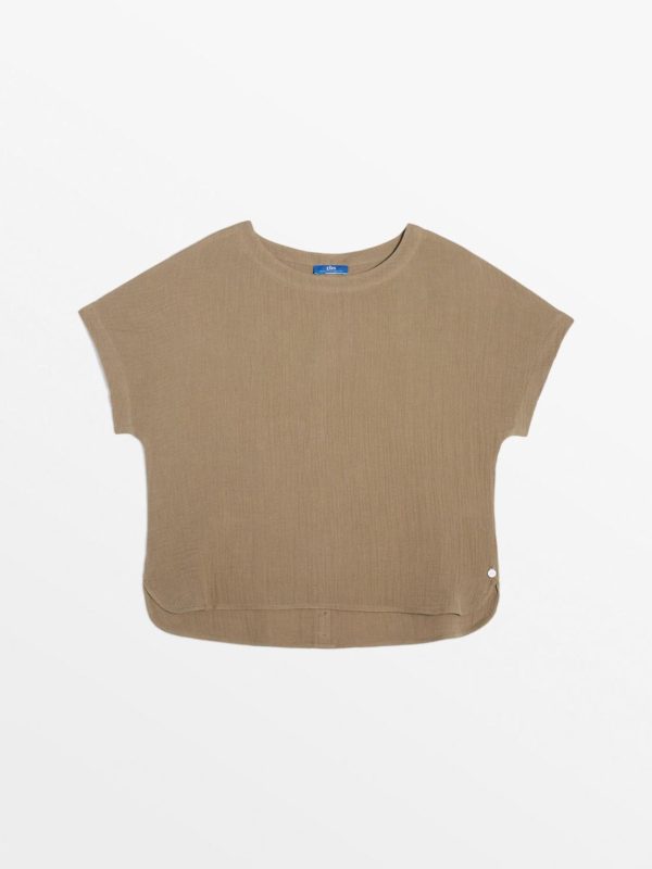 Blouse manche courte en gaze de coton idéale pour la saison, qui permet d’assurer confort et légèreté. Toute la singularité du modèle se trouve dans les détails, ses larges manches et sa fausse patte de boutonnage dans le dos.