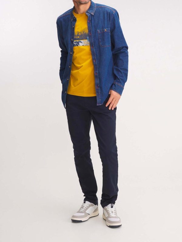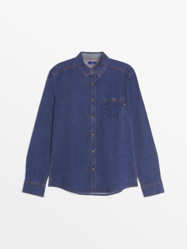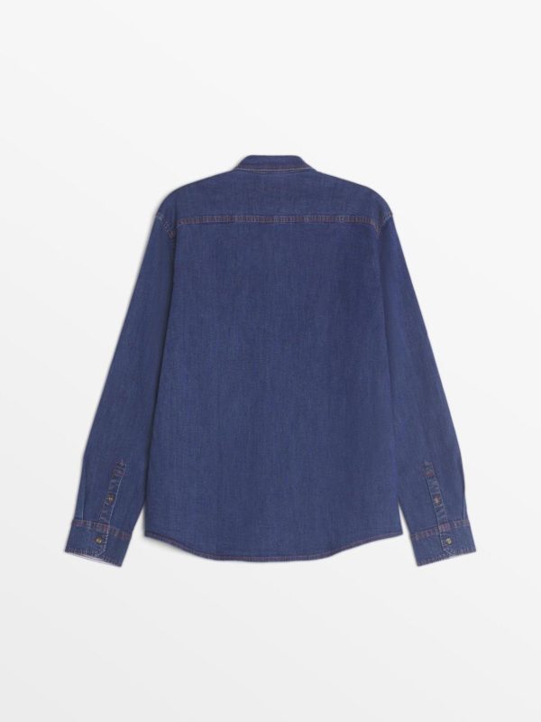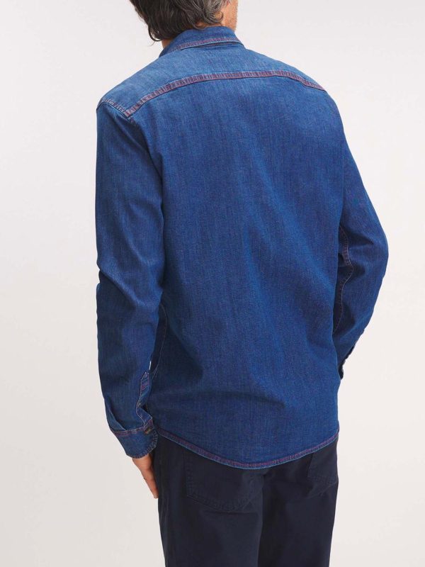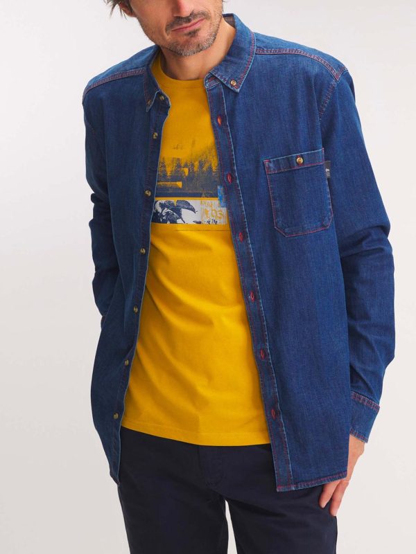 L’indispensable du vestiaire masculin, la chemise denim se colore d’une teinte de nautique par des empiècements intérieurs rayés.