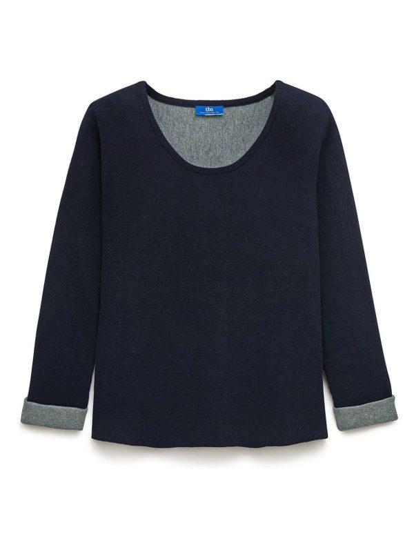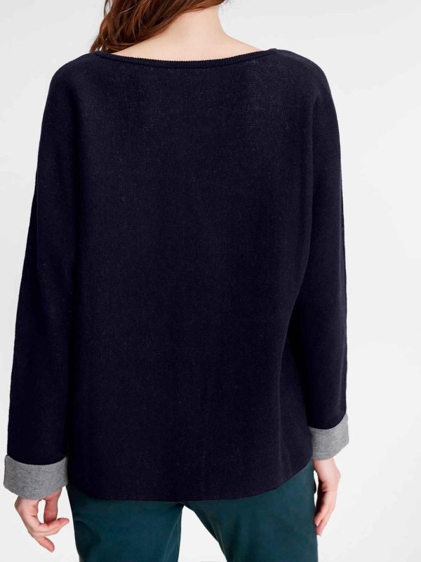 Pour un syle homewear et décontracté, optez pour ce pull oversize (coupe large) marine. Ses manches en contrastes jouent sur la fantaisie. Il vous maintient au chaud grâce aux 5% de laine!