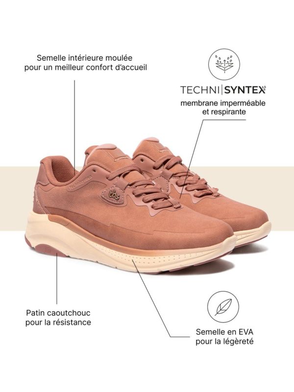 Cette basket aux allures sportives est idéale pour un usage actif au quotidien par tous les temps grâce à sa membrane imperméable et respirante. Sa tige (dessus de la chaussure) a un toucher peau de pêche pour plus de féminité. La semelle est fabriquée en EVA favorisant une légèreté incomparable et le talon est épais pour un meilleur amorti. Sur l’avant, la semelle est relevée pour un déroulé du pied optimum. Le dessous de la semelle a été pensé pour améliorer la résistance à l’usure grâce à des inserts en caoutchouc au niveau des points d’appuis (orteils & talons). Et enfin, sa semelle intérieure est rembourrée pour un confort d’accueil optimal. L’essayer c’est l’adopter !