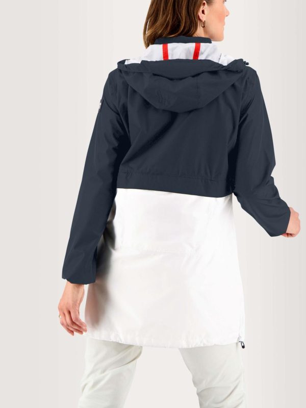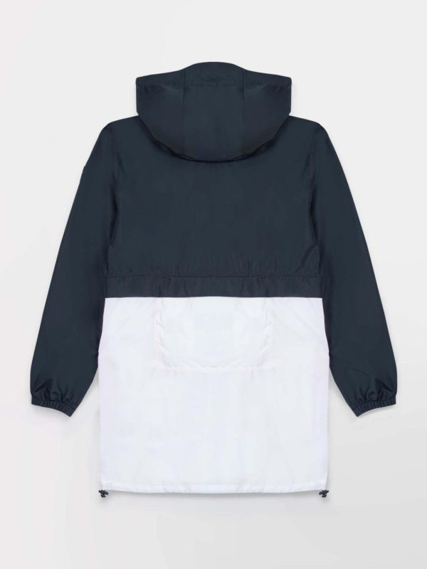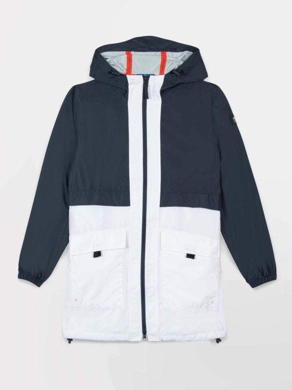 Par temps capricieux, choisissez ce coupe-vent imperméable (3000/3000: protection d’une pluie modérée pendant quelques heures). Cette veste vous suivra dans toutes vos aventures puisqu’elle se range facilement dans la poche du dos grâce à sa fonction compactable. Les grandes poches avant sont étanches et se referment à l’aide d’un rabat scratché. Sa capuche est non-amovible et s’ajuste facilement avec un cordon de serrage. Les détails nautiques ne vous auront pas échappé tels que sa teinte bi-colore blanc/marine, les coutures en zigzag rappelant la veste de quart et enfin le bas des manches et le bas de la veste resserrés par un élastique pour une protection supplémentaire.